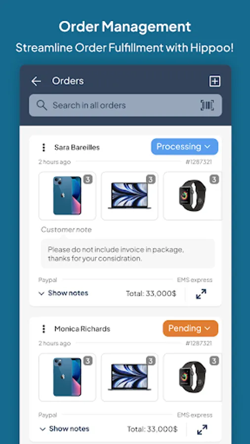 Hippoo! offers a convenient barcode scanning feature that enables you to find products swiftly by scanning product barcodes or SKUs. This saves valuable time and ensures accurate product identification, simplifying the order fulfillment process.