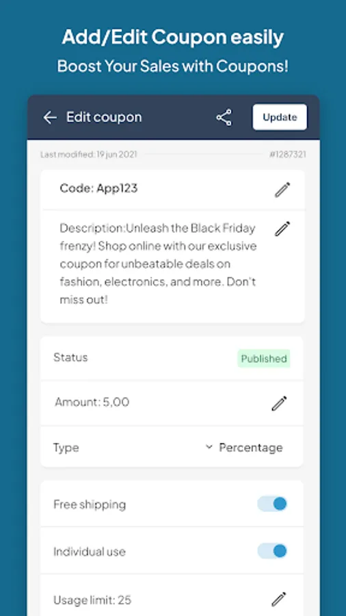 Boost sales and engage customers by generating custom coupons directly within the Hippoo! app. Create enticing discounts and promotions to incentivize purchases and build customer loyalty.