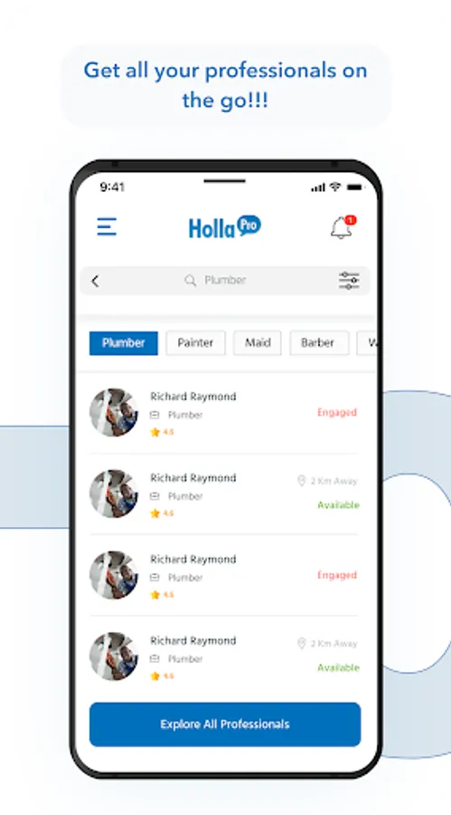 Go on HollaPro, search for the artisan you need, you can decide to filter with your location or filter generally. However if you filter with your location, the system will bring out the professionals close to you. Then the list of professionals you need their services will pop up, you can see the one that is free or currently engaged.