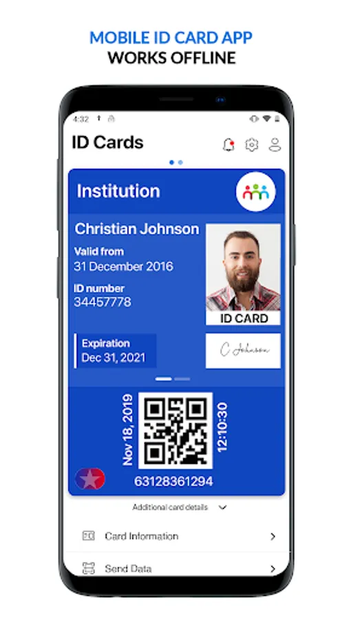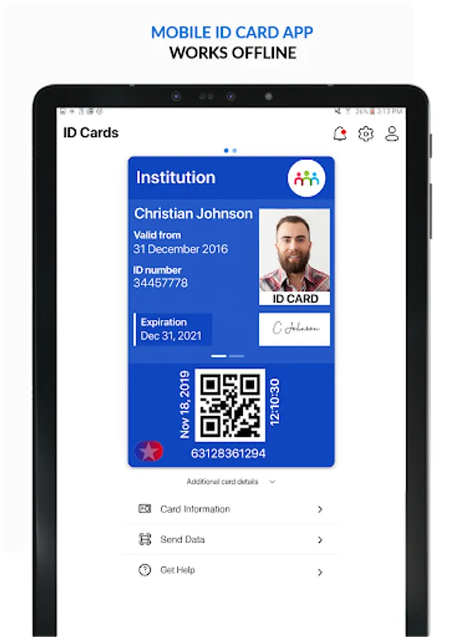 ID123 is a mobile ID card application for schools, businesses and membership organizations. Administrators can use the cloud-based ID management system to securely issue and manage digital ID cards into this mobile app.