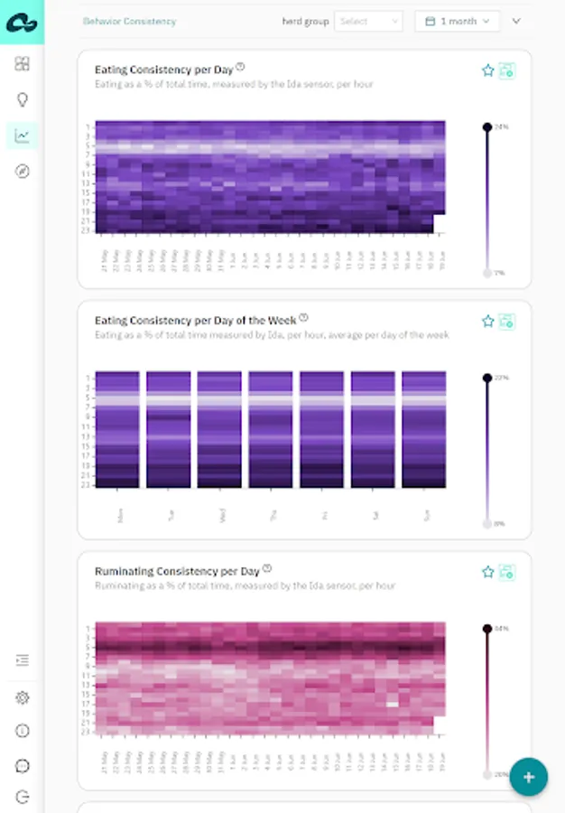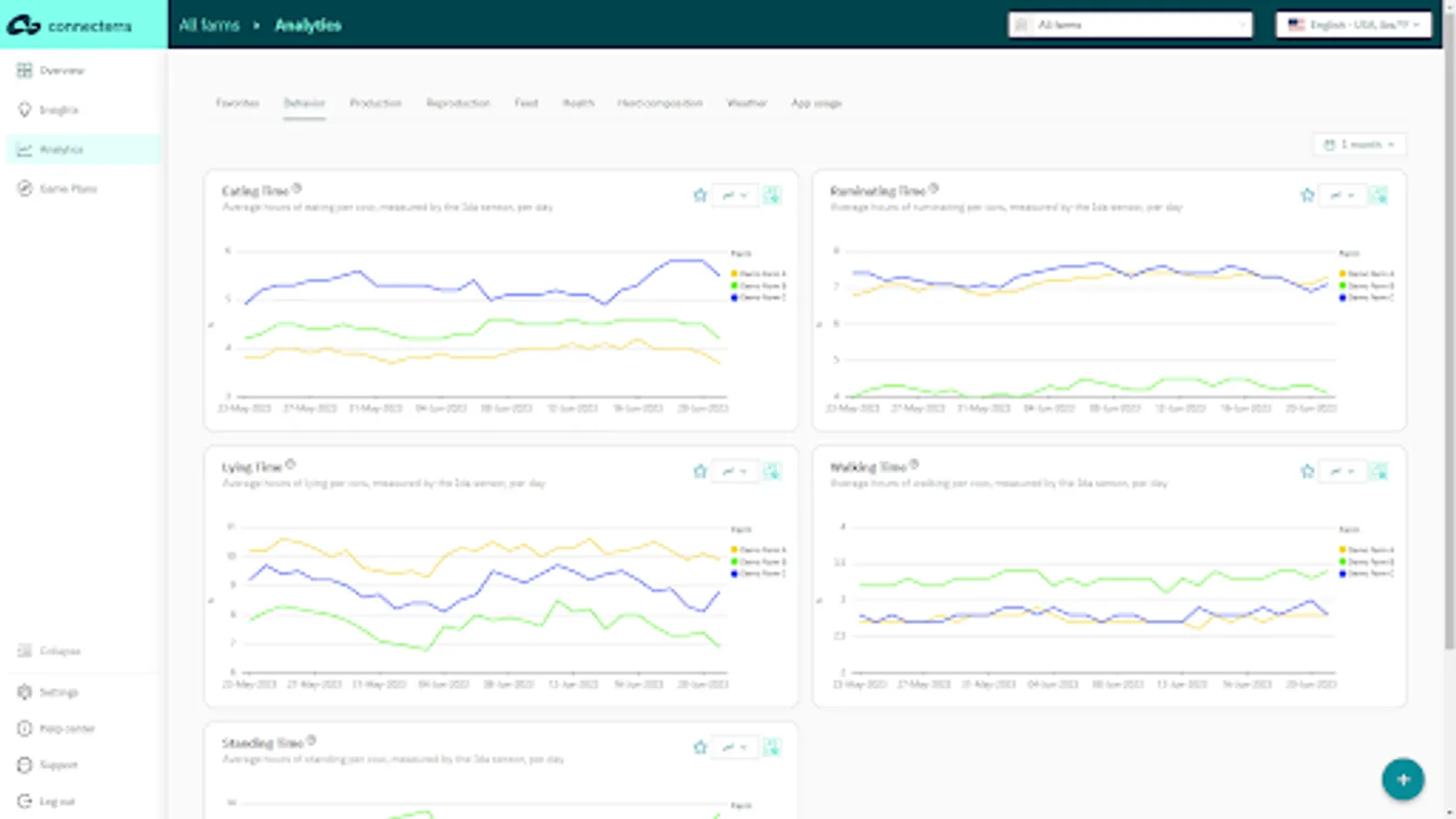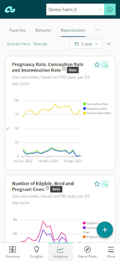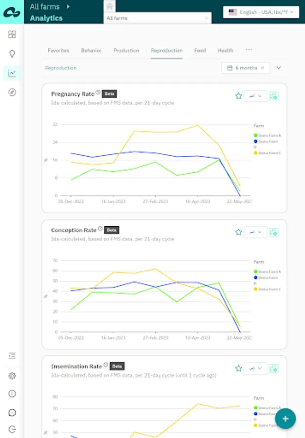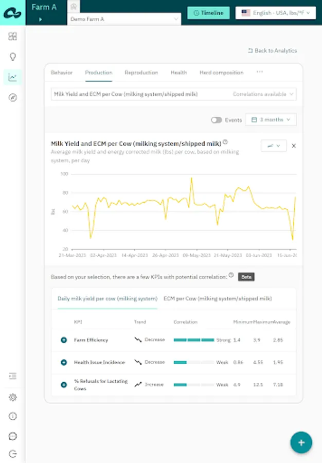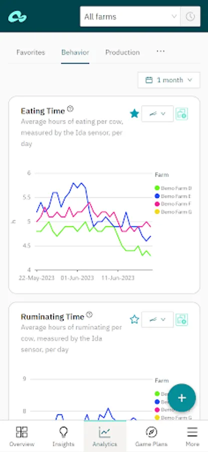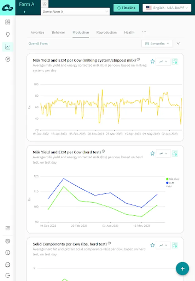 Analytics – analyze and compare farm KPIs to identify trends and opportunities for improvement. Available dashboards: Behavior, Reproduction, Production, Feed, Health, Herd Composition, Weather, App Usage;