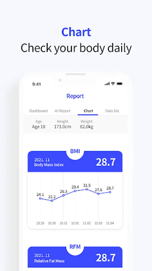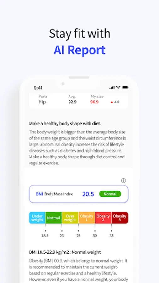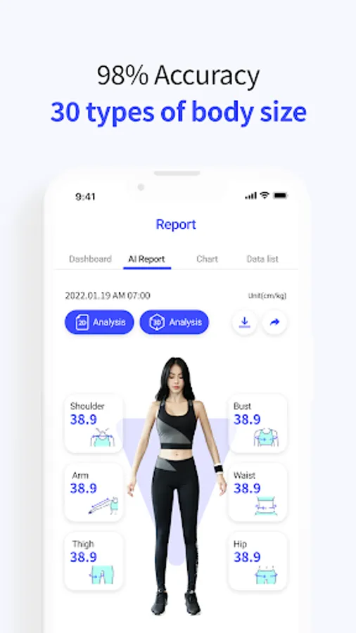 In simple 3 steps, you can measure 30 different parts of your body size. It helps your shopping and exercise.
