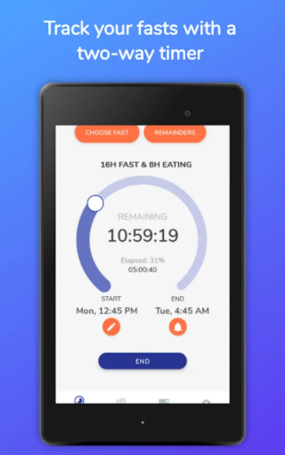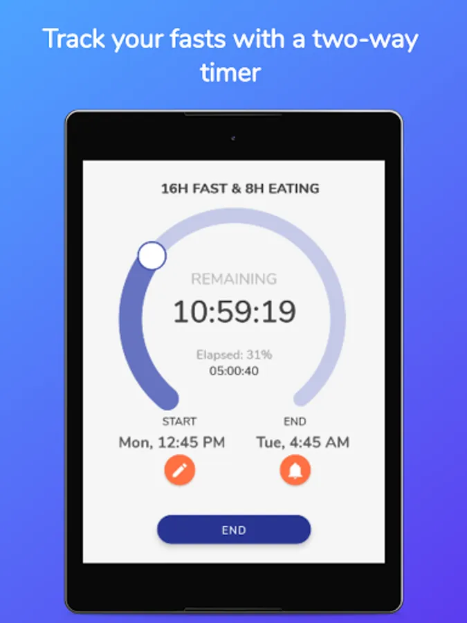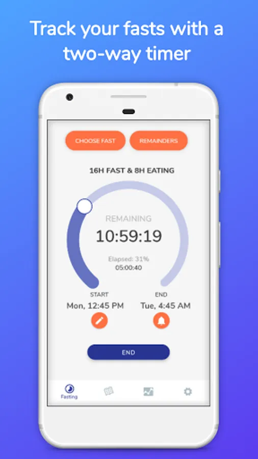 ⚡ Beautiful timer counting down the time from start of your fast till its finish. You can choose 5 fast length to accommodate your intermittent fasting preferences: