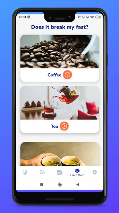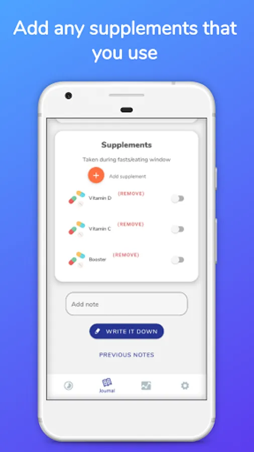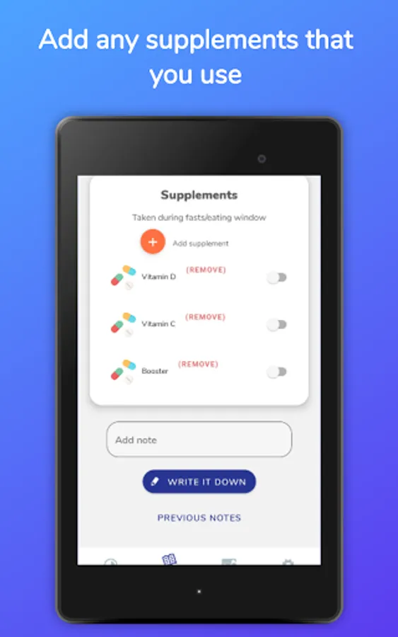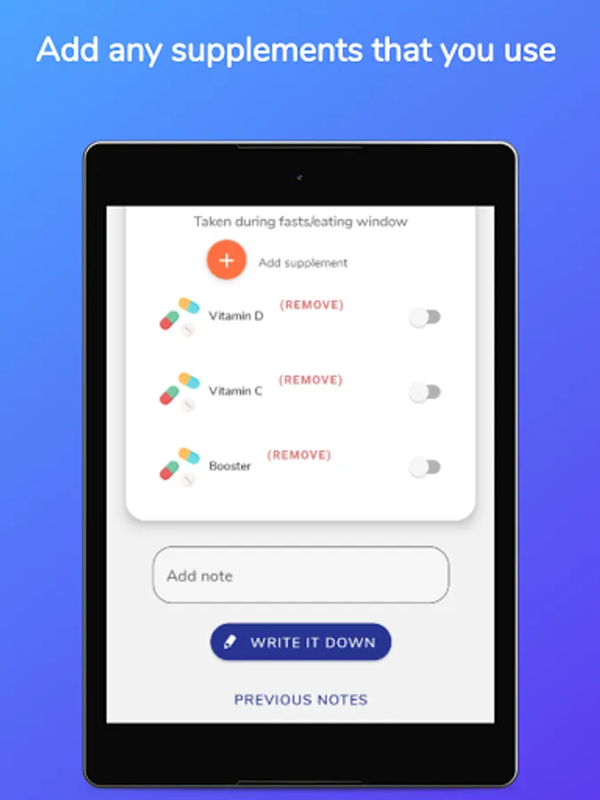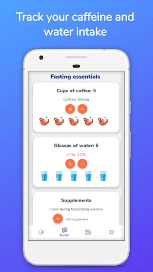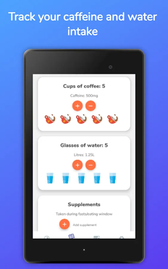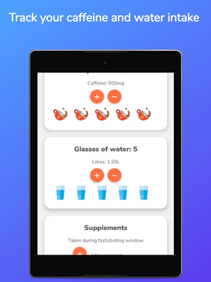 ⚡ Another feature of the app allows you to track your coffee, water and supplements intake. When you start intermittent fasting, you restrict your food intake, but you will continue to drink water and you may also choose to drink coffee or to take supplements and vitamins to give you additional boost of energy during your fasts.