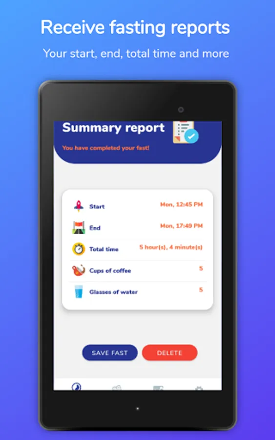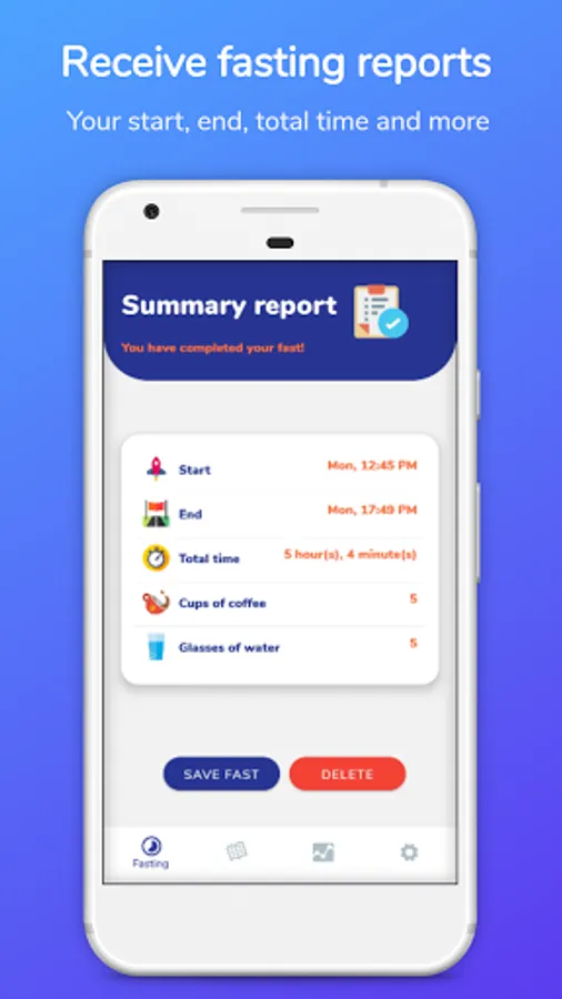 ⚡ Faster also provides you with basic data about your fasts that you will find in the stats screen. This includes the number of completed fasts, your most selected fast, total fasting time, your coffee and water intake.