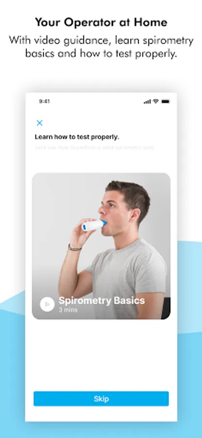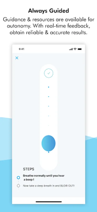 The SpiroHome App virtually guides patients step-by-step through set-up, testing, and reporting. Features to improve spirometry technique and ensure reliable results are obtained include,