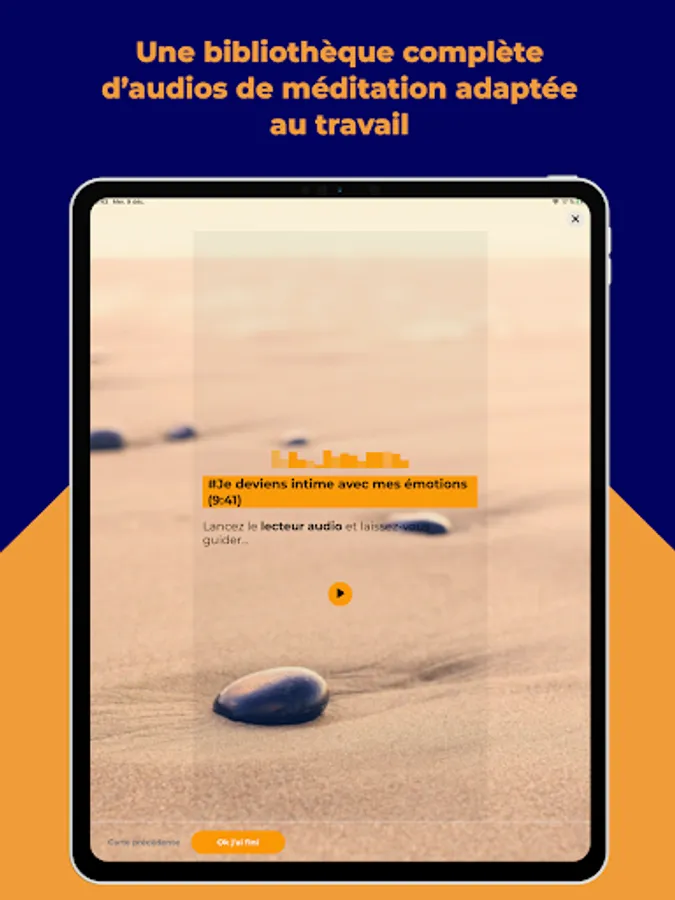 > A library of dozens of guided meditation audio files, accessible to everyone to start meditation anywhere, anytime or deepen your practice according to your needs: reduce stress, gain confidence, well-being, feel more pleasant emotions, find inner calm... From 3 minutes to 15 minutes, choose the meditation duration that suits you best.