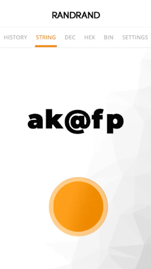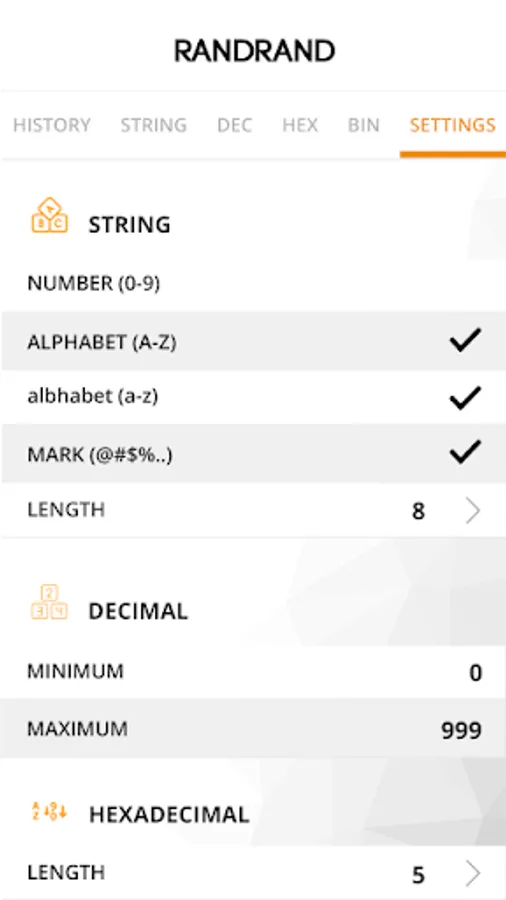 - Generate random string by you can select string length(1-16) and string type ( Numbers(0-9) Alphabet(A-Z) Alphabet(a-z) Mark(special characters) ) from settings screen