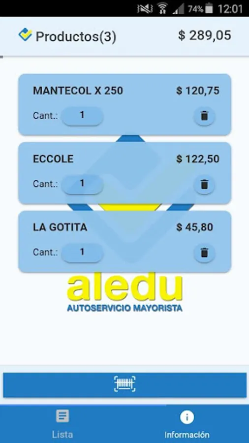 With this application you can know the prices of the products just by scanning your barcode and putting together a shopping list, in the ALEDU store. You must connect to the local WIFI to use the application. Not only allows to know the price of the product in moments, but also the possibility of keeping the purchase registered so that there are no surprises of amounts when arriving at the line of boxes.