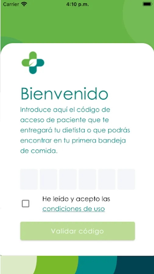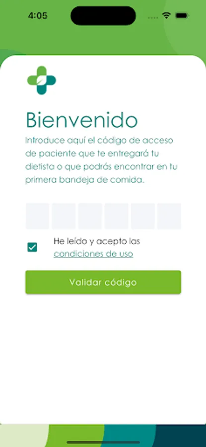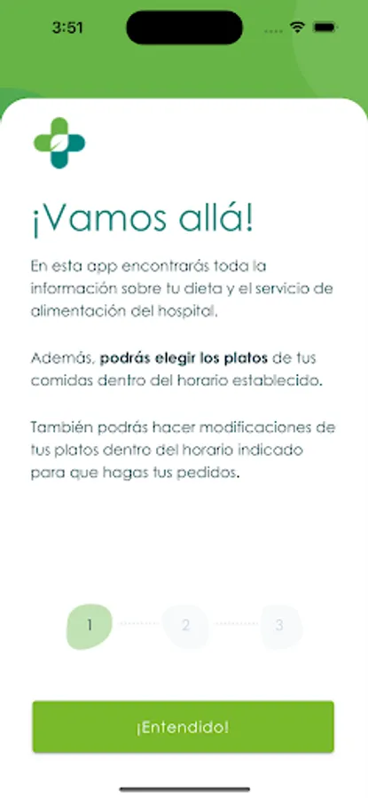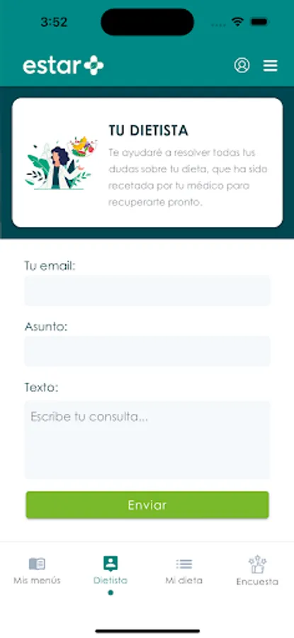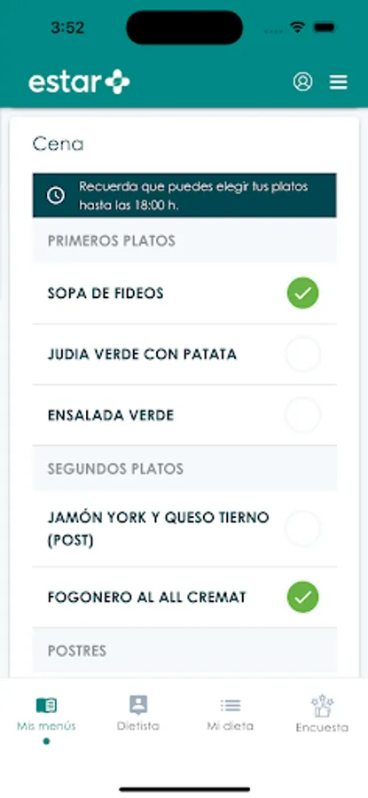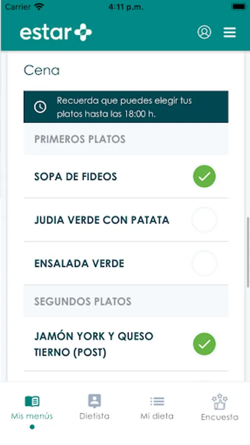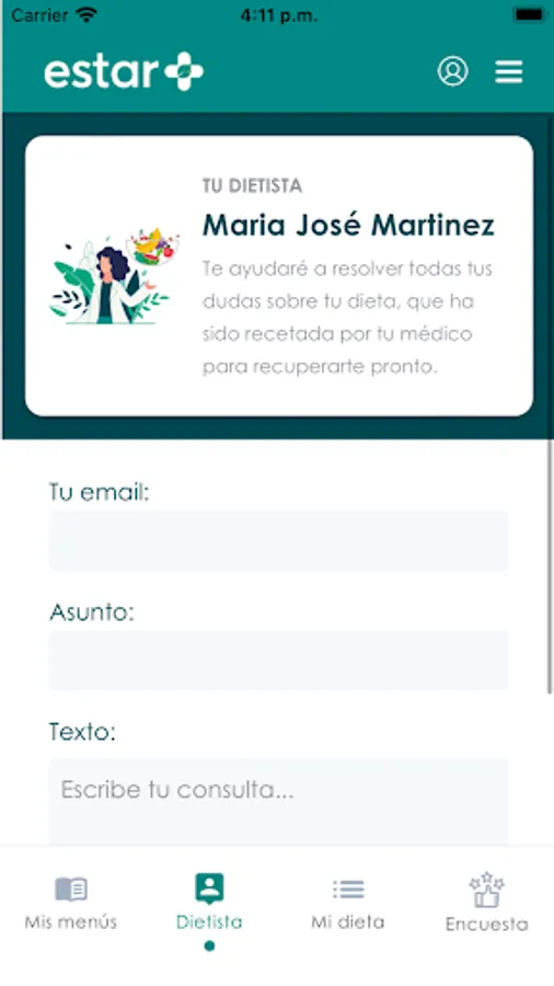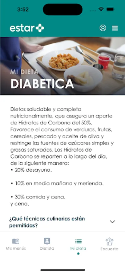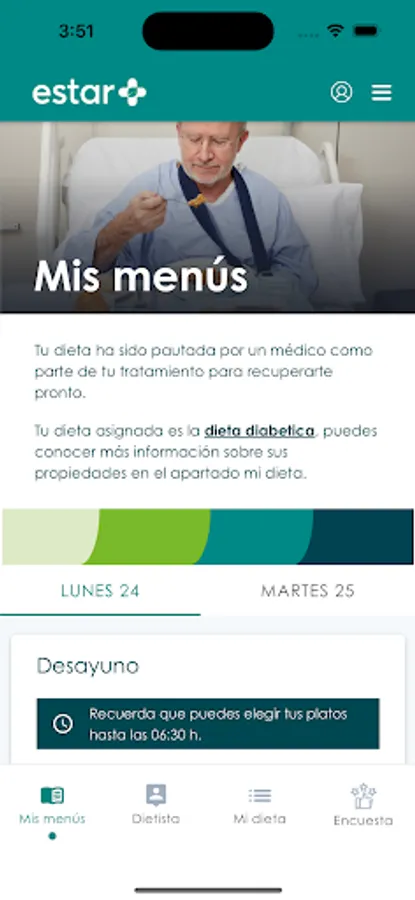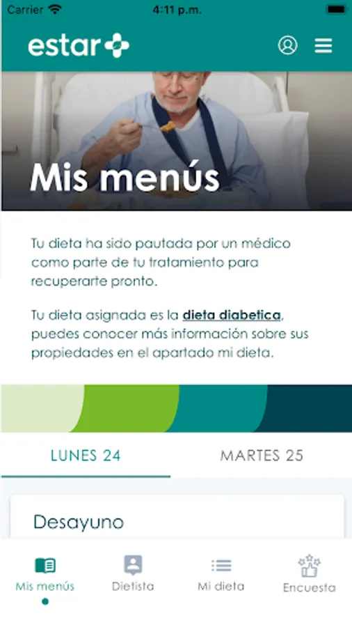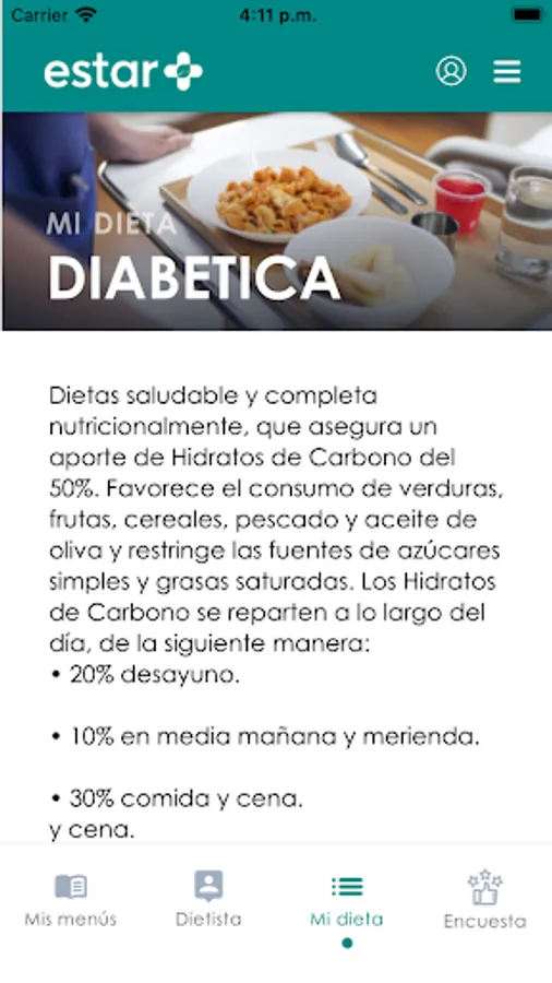 App to consult and choose menus for each intake (breakfast, lunch, snack, dinner). It is possible to see the information on the type of diet and make a query to the nutritionist team.