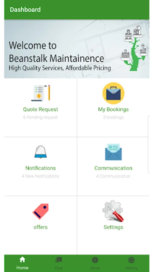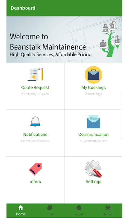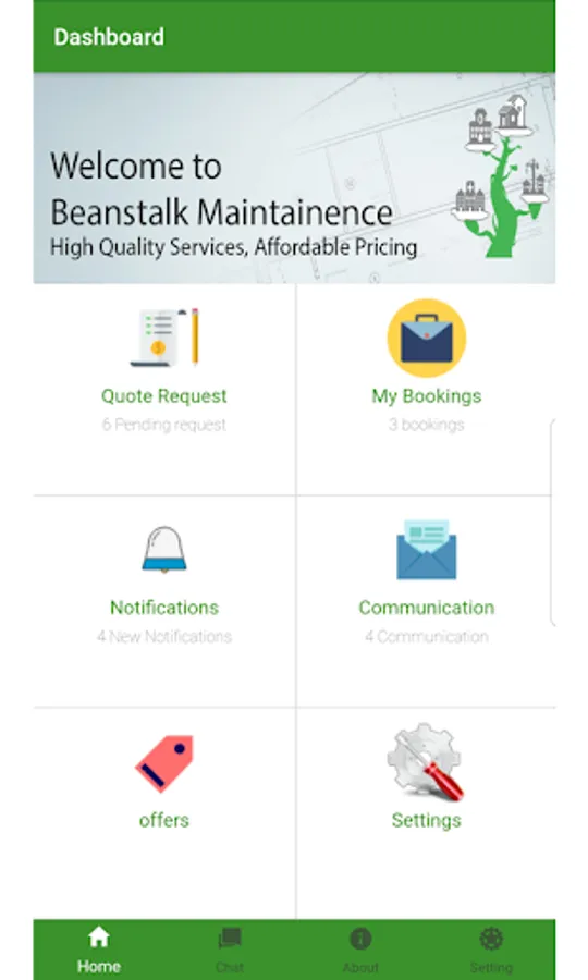 Beanstalk Maintenance app allows all our clients to make an account with us, which will allow clients to request quotes, see bookings, and communicate with us. The owners of Beanstalk Maintenance have always believed that communication is the key in the cleaning industry; well we have fixed that problem; take a picture and chat with us through the Beanstalk Maintenance app.