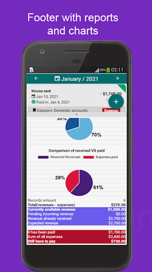 The app will automatically draw up current balance and create a pictorial diagram showing your spending patterns (expenses and income);