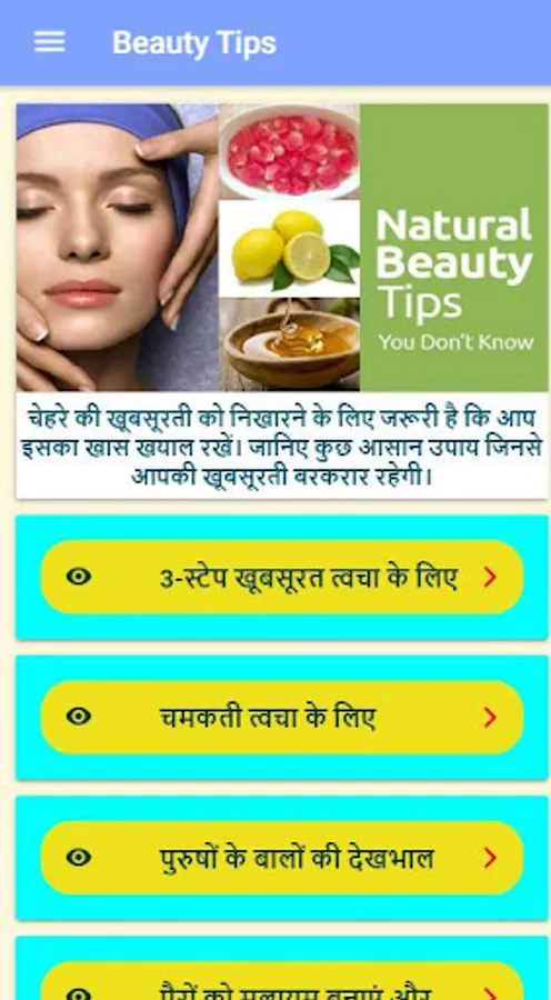 This App includes Ayurvedic Treatment in Hindi, Natural Beauty Tips and Ayurvedic Herbs details.