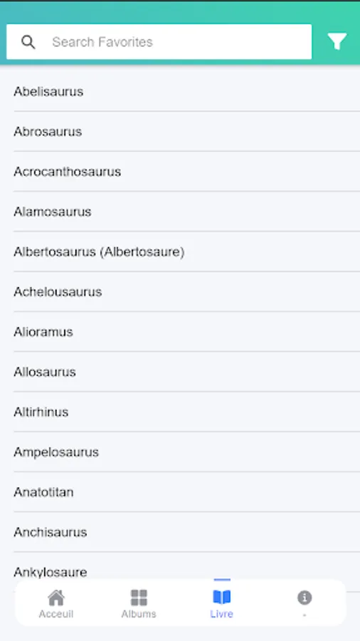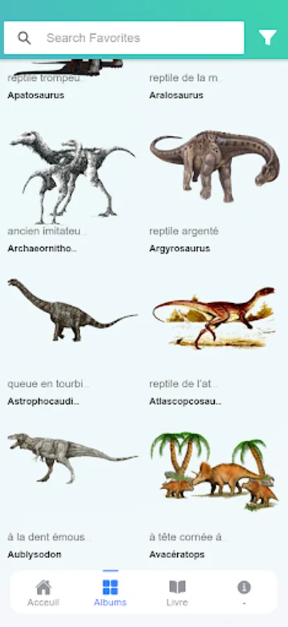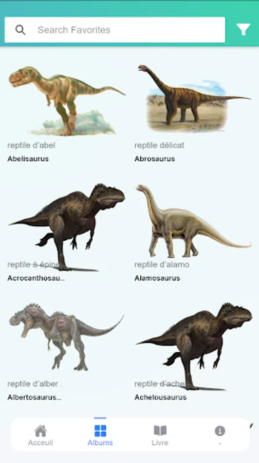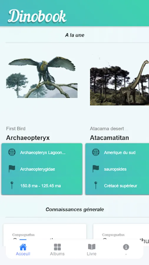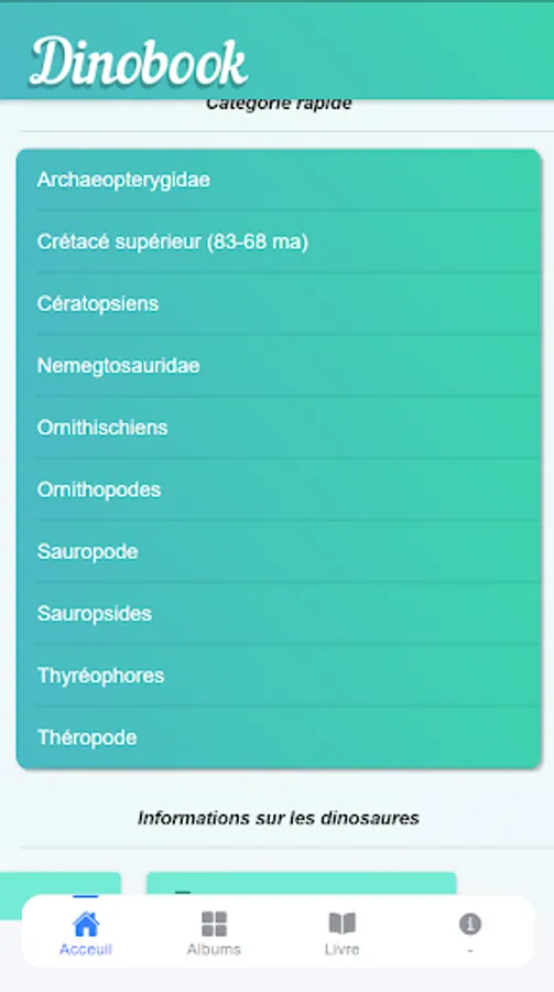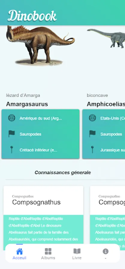 Dinobook is an encyclopedia in your pocket. it lists a large number of dinosaurs that have lived. all the dinosaur list sort and categorize for one, mind blowing experience.