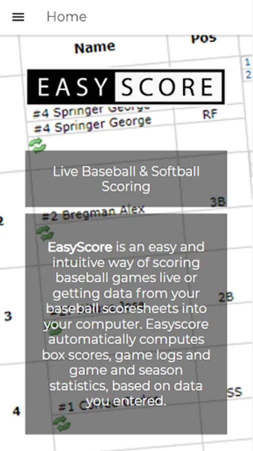 EasyScore is an easy and intuitive way of getting data from your baseball and softball scoresheets into a computed form. Easyscore automatically computes box scores, game logs and game and season statistics, based on data you entered via the app.