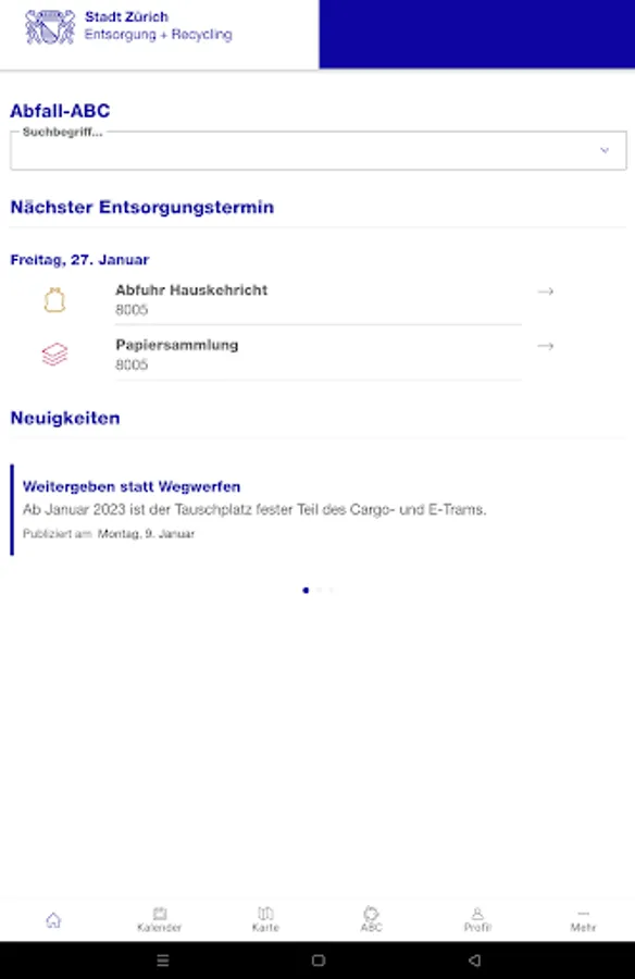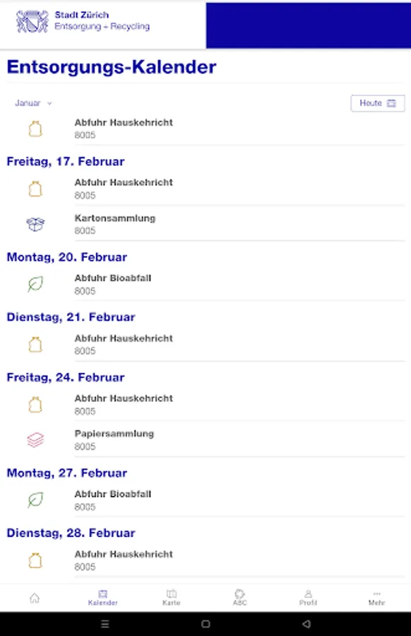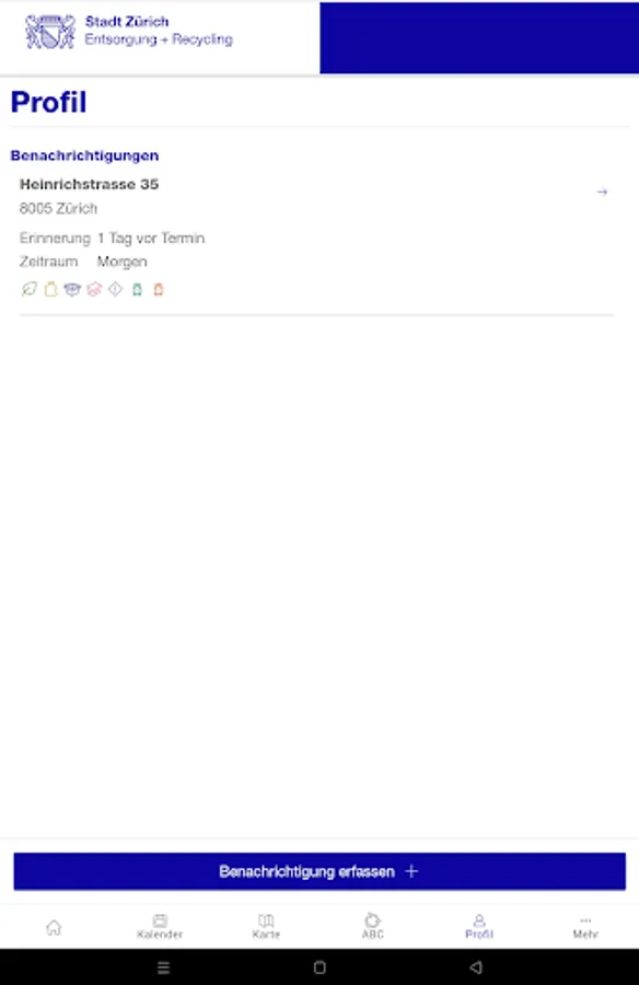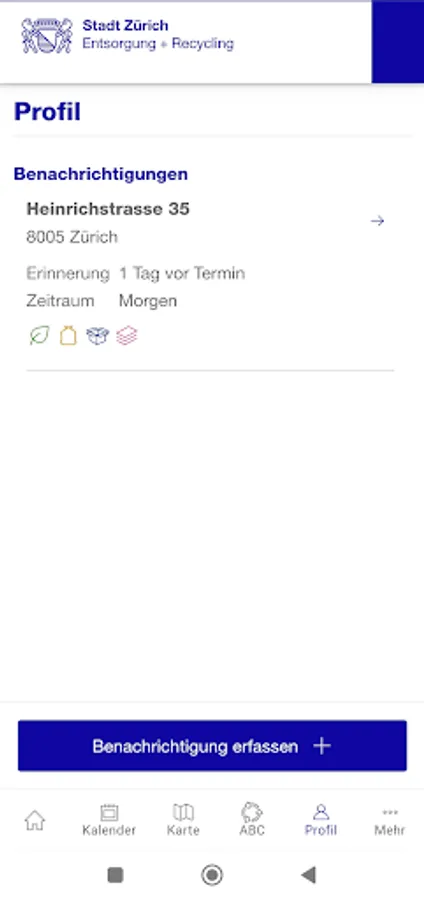 - Reminder function (push notifications or e-mail reminders must be activated in the settings) of all collections and collections in the city of Zurich for any number of saved addresses: household waste, organic waste, paper, cardboard, textiles, cargo and e-tram