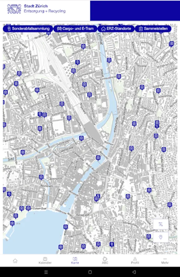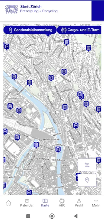 - Map with all recycling points, recycling yards, cargo and e-tram stops as well as other locations of Entsorgung + Recycling Zürich