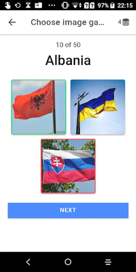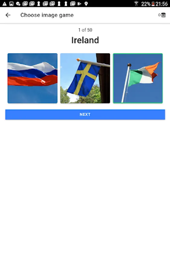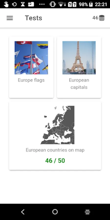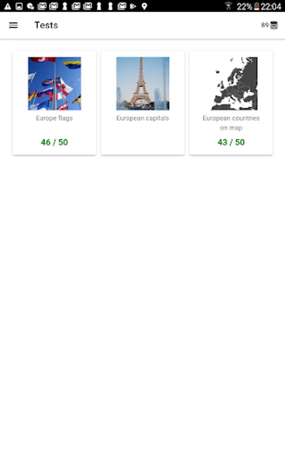 Quizzes cover three topics: flags, localizations on a map and capital cities
