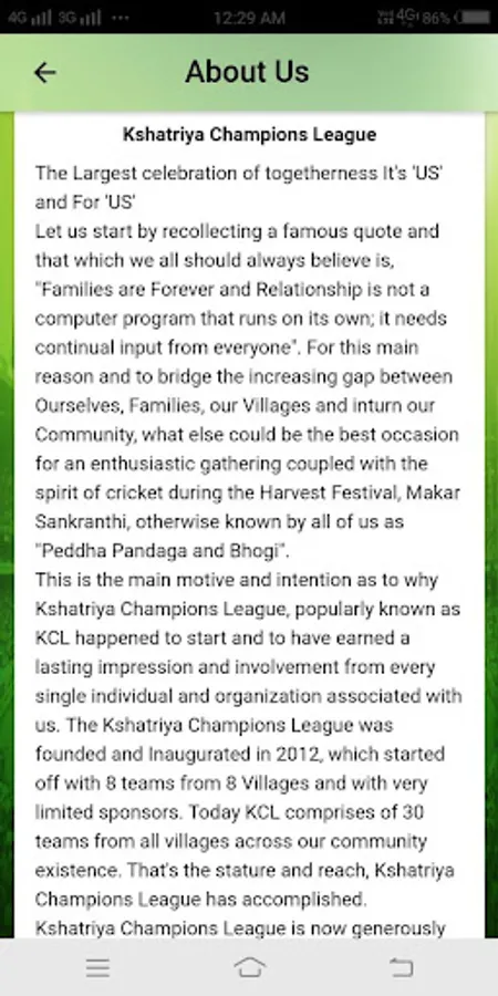 The Kshatriya Champions League Charitable Trust was founded and Inaugurated in 2012, which started off with 8 teams from 8 Villages and with very limited sponsors. Today KCL comprises of 30+ teams from all villages across our community existence.