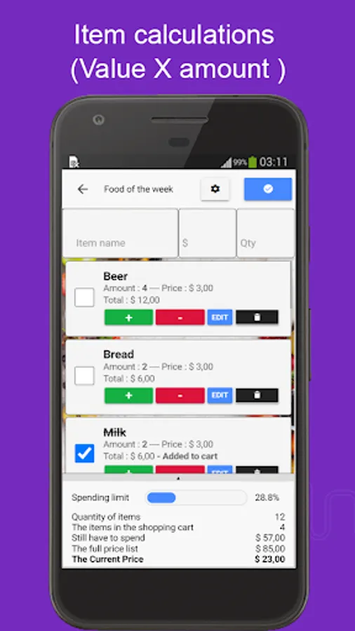 * Lists are reusable. So for example, if you make a grocery list to shop for groceries at the local grocery store, it can be reused over and over again. There is no need to keep making a new one each time. Just make it once, and after that just check and uncheck the items. It will be uniquely yours and will always have the items you buy.