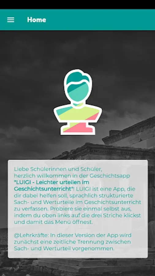 Luigi is an app designed to help students to write linguistically structured factual and value judgments in history lessons. For example, explanatory videos, sample texts, a writing check with a tick function, formulation aids and argumentation criteria as well as an operator list are available.