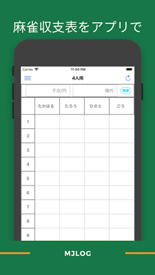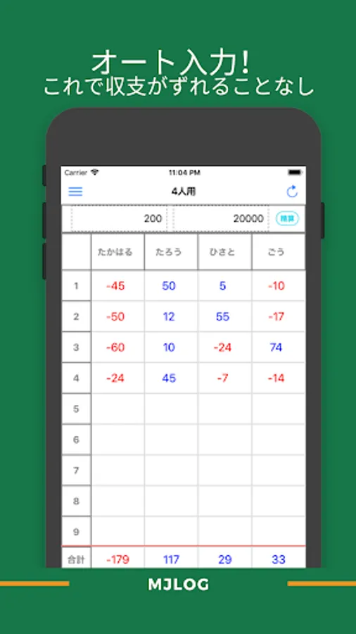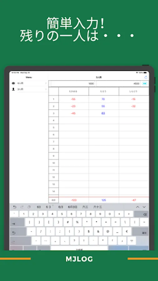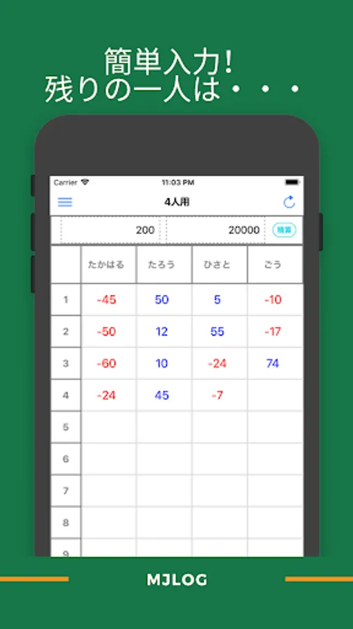 4人麻雀の場合なら3人のスコアを入力すると残りの一人は自動補完で入力します。