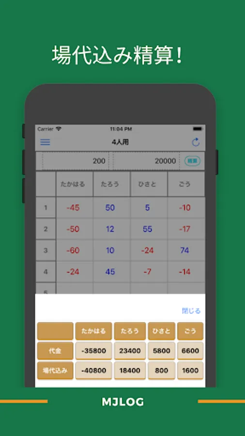 精算ボタンを押すと、レートをかけた値と場代を割り勘で引いた値を表示してくれます。