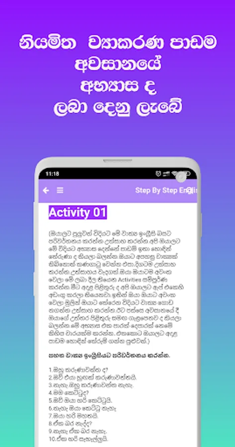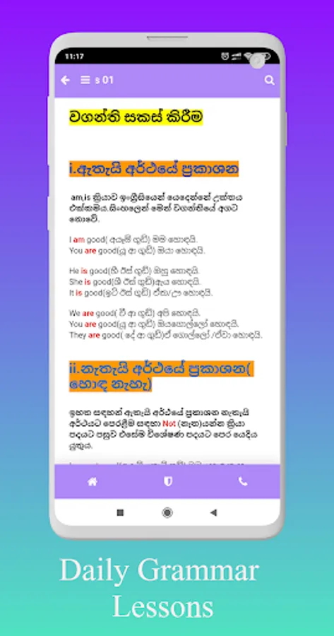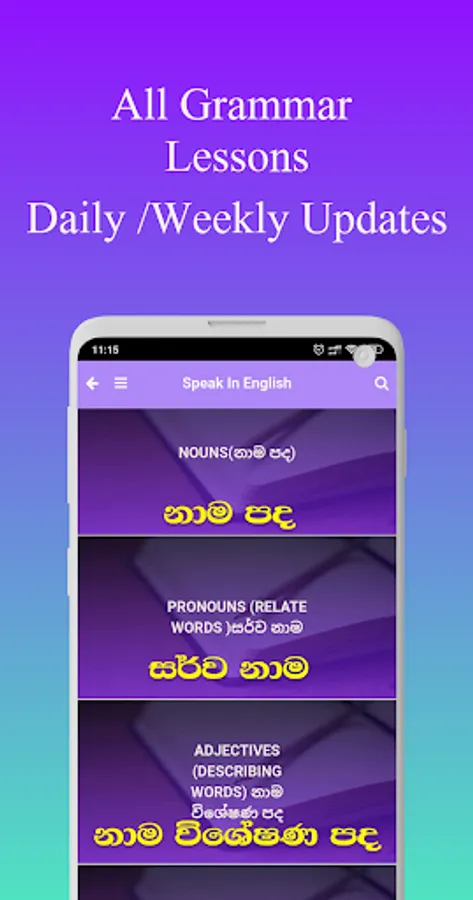 එහෙනම් ඔයා මේ තෝරාගෙන තියෙන්නේ ඔයාට ගැළපෙනම app එක .දන්නා සිංහලෙන් සරල මට්ටමේ ඉදන් සංකීර්ණ මට්ටම දක්වාම දිනපතා ඔයාට ඉංග්රීසි ව්යාකරණ පාඩම් ඉදිරිපත් කරනු ලබනවා ,ඒ විතරක් නෙමේ පාඩම අවසානයේ අභ්යාසද ලබා දෙනවා