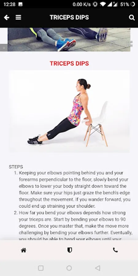 Before starting you should warm up for about five minutes, with a brisk walk or jog around the block, skipping or jogging on the spot. Perform the following exercises in order, aiming for 3 sets of 12, meaning that for each exercise you should perform up to 12 repetitions (unless noted otherwise in the instructions), and complete 3 sets of each exercise before going on to the next. At first you may wish to aim for 2 sets of 8, and build up from there. You should rest for a couple of minutes between each exercise. Alternatively, you can group two exercises (which use different muscle groups), and alternate between the two which gives each muscle group a rest while you are working out another.Step Ups