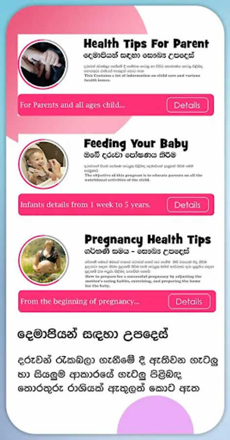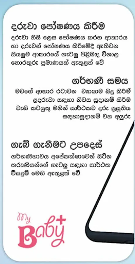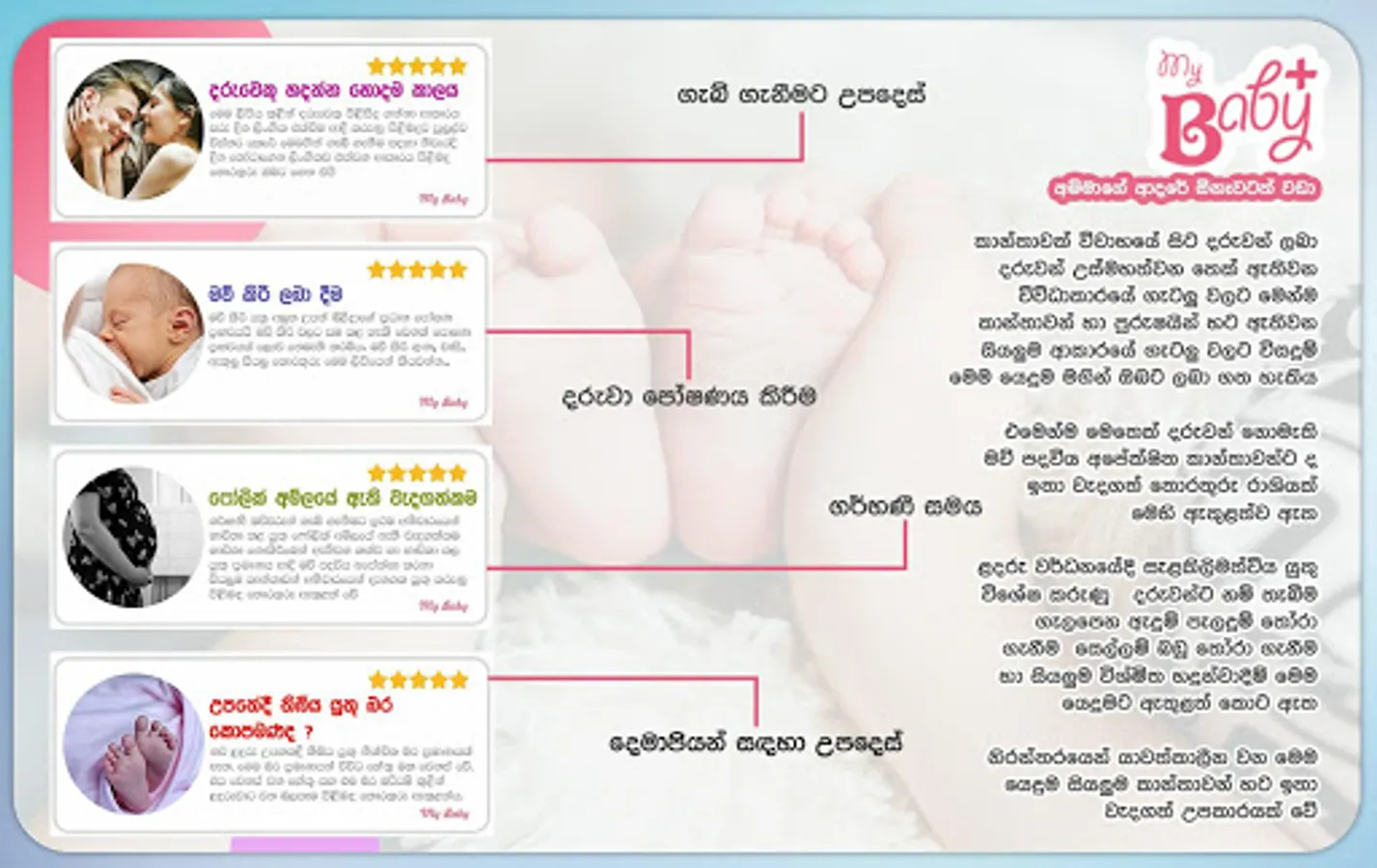 වැනි කරුණු පිළිබඳව හා විවාහ වීමට පෙර කාලයේ සිට දරුවාට වයස අවුරුදු 10ක් පමණ වනතෙක්, දරුවා රැක බලා ගන්නා ආකාරය පිළිබඳ සියලු, ඔබ නොදත් තොරතුරු රාශියක් මෙම යෙදුම (My Baby) මගින් ඔබට දැනගත හැකිය. එමෙන්ම ඔබට ඇතිවන ගැටලු ද අපට යොමු කිරීමට අවස්ථාව ලබා දී ඇති අතර එවැනි ගැටලු සඳහා සවිස්තරාත්මක විසදුම් ඉතා ඉක්මණින් අප ඔබ වෙත ගෙන ඒමට සියලු කටයුතු සූදානම් කර ඇත.