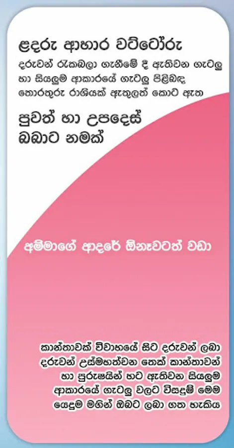අප කළ සමීක්ෂණයට අනුව කරුණු සළකා බලා මව් පදවියක් අපේක්ෂා කරන හා දරුවන් ලද මව්වරුන්ට අවශ්ය සියලුම විෂයන් වලට අදාල ඉතා වැදගත් තොරතුරු රාශියක් ගෙන ඒමට අප තිරණය කර ඇත. මෙම යෙදුම මගින් මව්වරුන් පියවරුන් වීමට අපේක්ෂා කරන හා දැනටමත් මව්වරුන් පියවරුන් වී සිටිනා සියලු තරුණ තරුණියන් හට ඇතිවන සියලුම ආකාරයේ ගැටලු පිළිබඳ පුලුල්ව සාකච්ඡා කෙරේ.