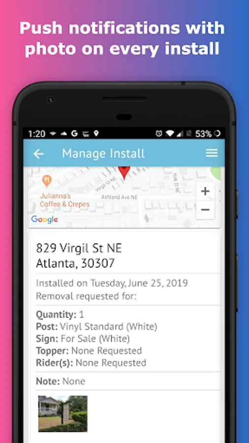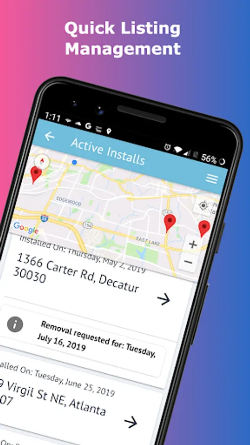 We're excited to bring some much needed innovation to the real estate sign post business. We make it easy to manage all your installations and inventory. You'll get a push notification immediately upon us servicing your jobs with a photo of each install. Manage your toppers/riders inventory from the palm of your hand so you know when you need to re-order more. Any agent or office admin can control your entire team's listings using just PutPostIn to schedule, change, or remove signs across all of Metro Atlanta. We offer free sign storage in our warehouse. We will even go pick up your signs from your current storage area and move them to our warehouse free of charge. Download the free app and get started!
