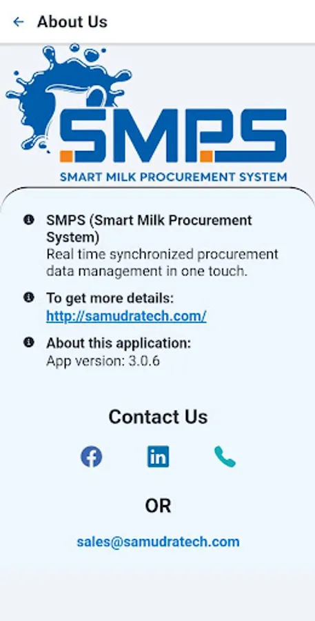 Samudra’s SMPS is used at MPP to collect milk from registered members. It has real time data collection and synchronization. Also it keeps a shift and type wise dispatch. There are also some reports like Masters, Shift report, member wise ledger, collection summary, kgFat kgSNF summary and daily pouring details. In this app, We provide Bluetooth machine settings, so that this application can read data automatically without plugin. For this Application Simply user can access this application by signing up with their registered mobile number and the SMPS ID of MPP.