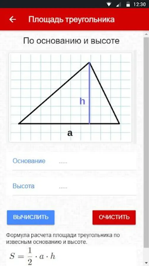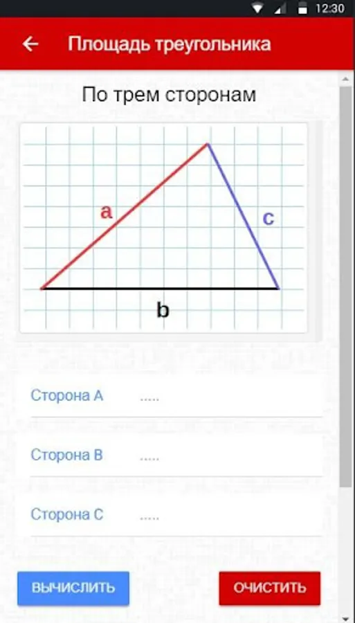 Convenient calculator for calculating the area of triangles. Simple calculation based on known values: base and height, on three sides, on 2 sides and angle between them.