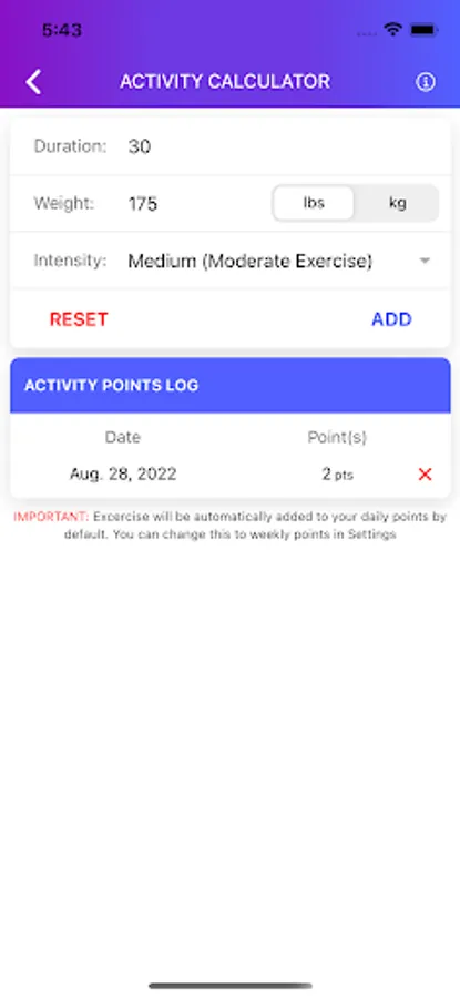 This feature turns exercise into consumable weekly point. Input your current weight, duration, and workout intensity to calculate the point value of your exercise. The resulting point totals will appear in a table viewable on this page and automatically added to your weekly point allowance. We are currently working on integrating the ability to connect to external exercise data (ie. Fitbit) as well.