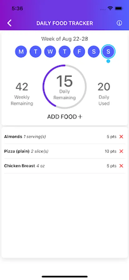Use this feature to track and review your daily/weekly point usage. A food or drink item and its point value can be added manually, selected from a user-defined food list, or by scanning food barcodes or using our voice recognitions technology and adding them automatically. The goal of this page is to provide an easy-to-use, efficient method for monitoring food consumption, ensuring the user remains within the bounds of their daily and weekly point allowance.