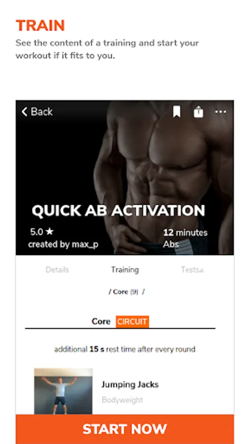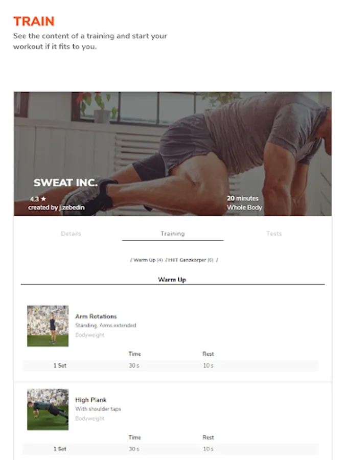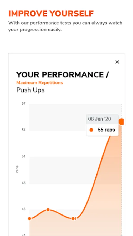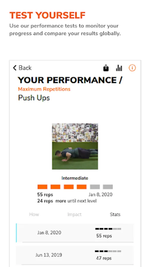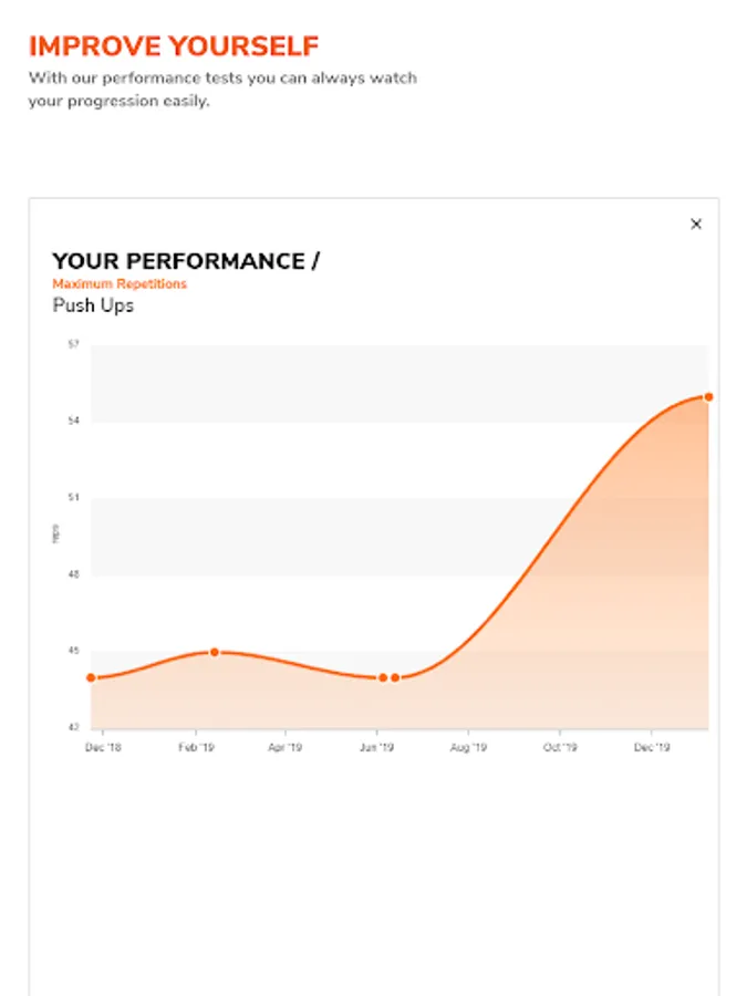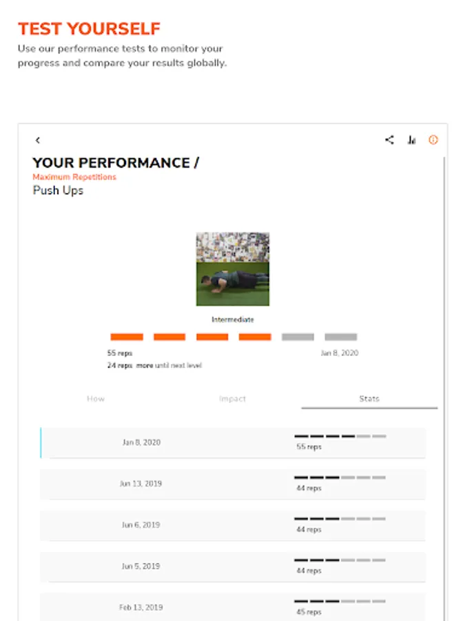 – Test your progress with our performance tests (1 Rep Max Bench Press, Max Repetitions Push Ups, ...)