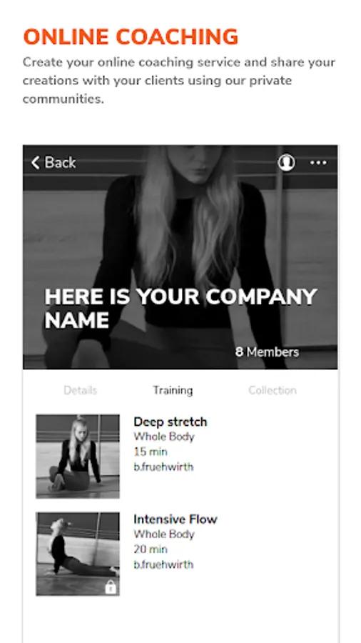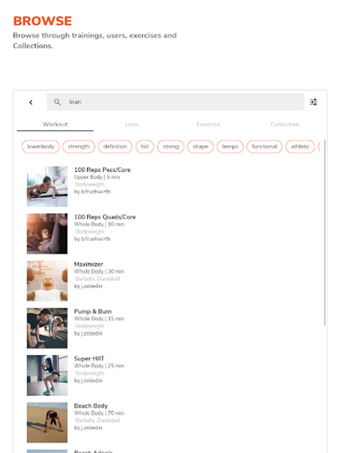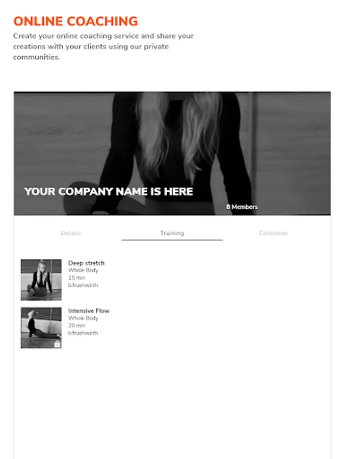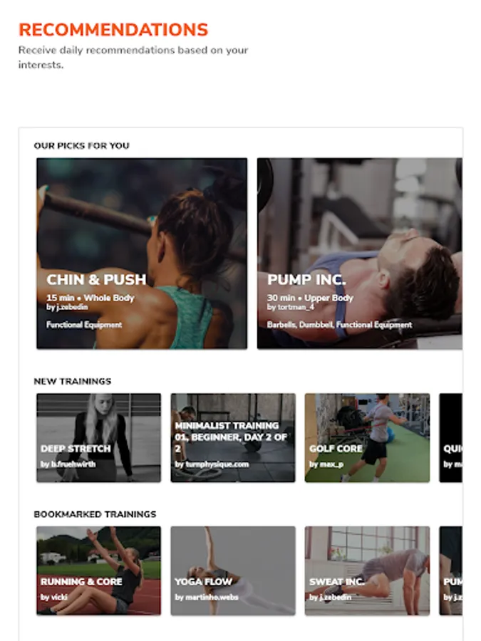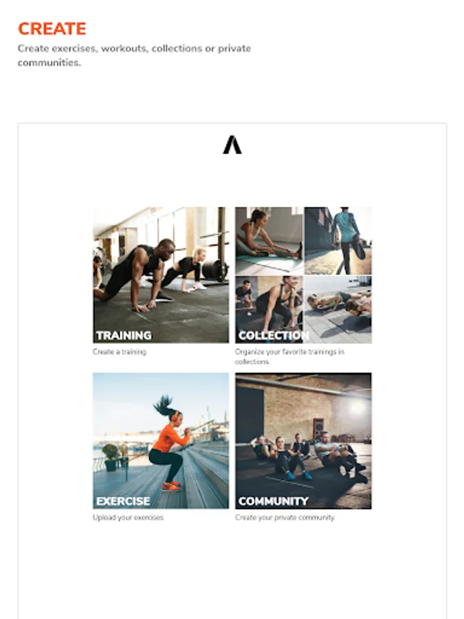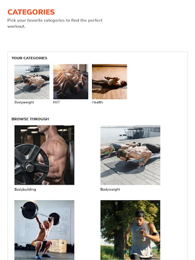 Our categories cover sport performance, body weight, bodybuilding, crossfit, endurance, functional training, health and HIIT and weight training. So you can workout at home, in your fitness studio, outdoor, or even in your office.