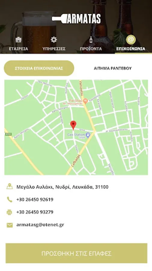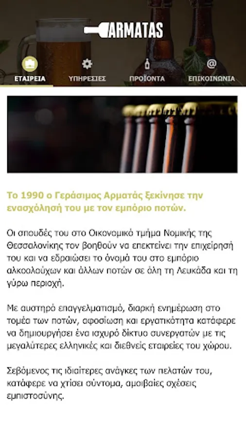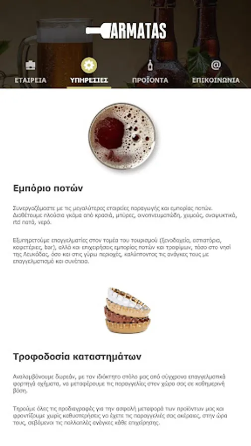 The "Amfitas" Drinks Trading Company has 1,000 sq m of facilities in Megalo Avlaki, Nydri, Lefkada. It provides its customers with a wide variety of wine, beer, alcoholic beverages, water and soft drinks labels.