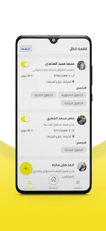 الشرعية ، المدنية ، الجزائية ، القضاء الاداري وقضاء الموظفين ، الدعاوى الدستورية الخاصة بالمحكمة الاتحادية العليا ، دعاوى قوى الامن الداخلي والدعاوى المصرفية كافة ودعاوى محكمة العمل ، تنظيم وتسجيل كافة الشركات