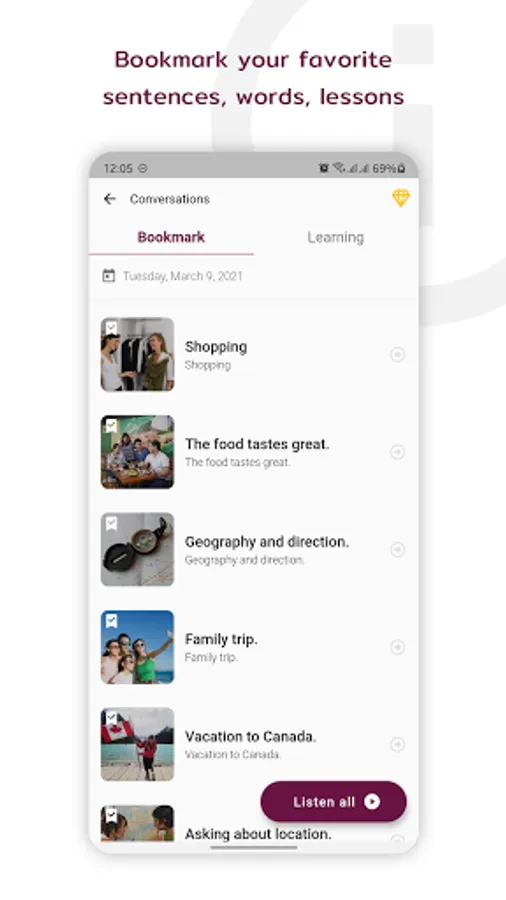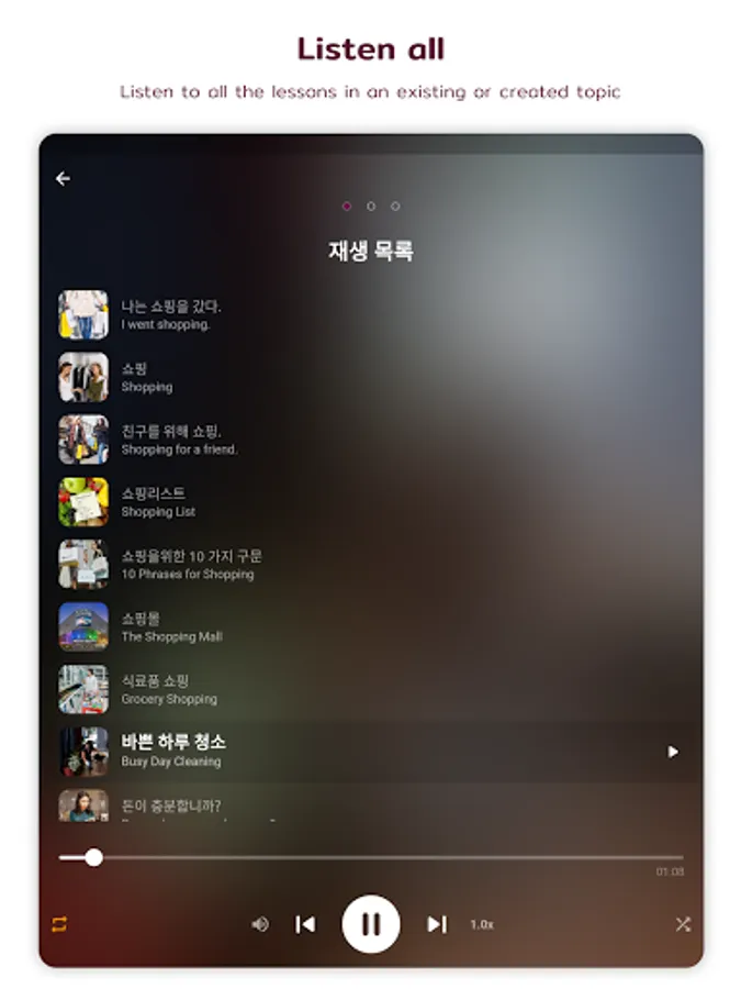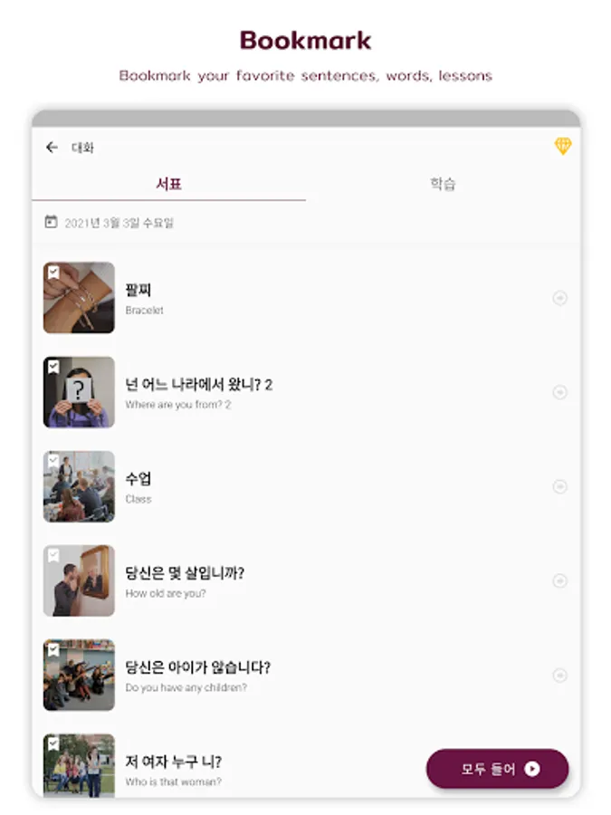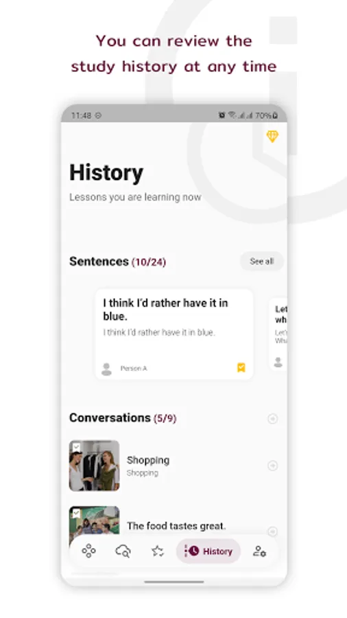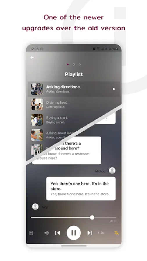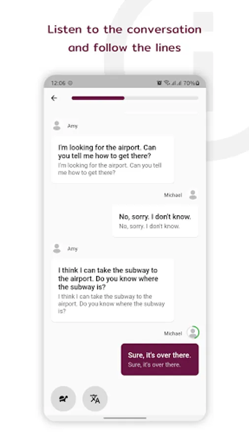 + Listen to conversations: play the entire conversation one-by-one subject with both male and female voice. Replay for listening as much as you want.