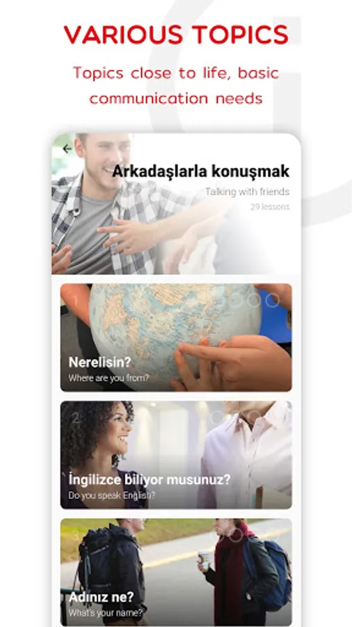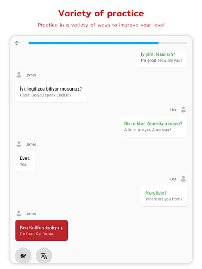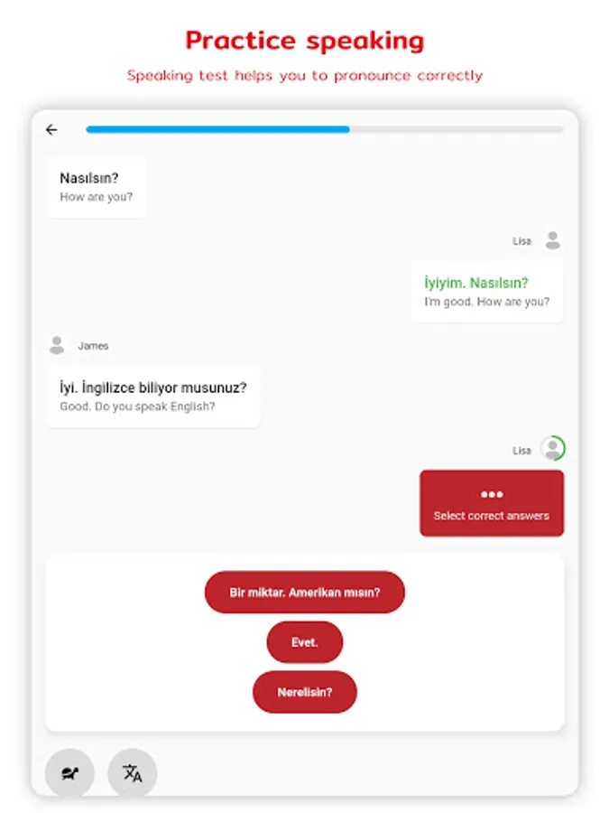 With Turkish Listening & Speaking, users have access to a broad range of video lessons that enable them to practice their conversation skills with genuine Turkish videos, and the best part is that they are now free forever. Our dialogue-based approach immerses users in practical scenarios, allowing them to gain first-hand experience with the language.