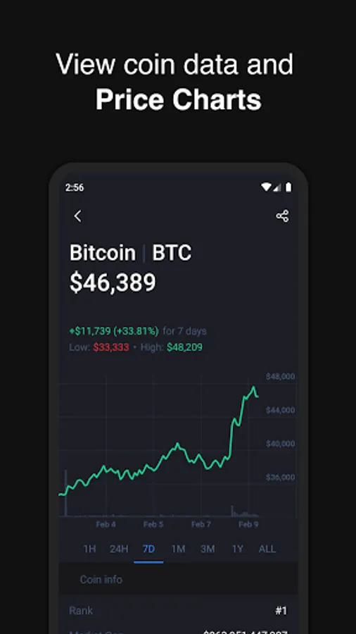 • 📈 View real-time interactive charts of coin price for different time ranges against either popular currencies or Bitcoin