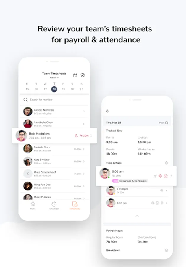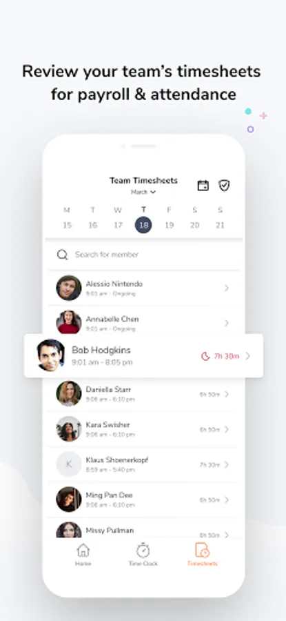 View and manage your team’s timesheets from your mobile. Choose between monthly, bi-weekly or weekly pay periods to approve timesheets and speed up your payroll process.