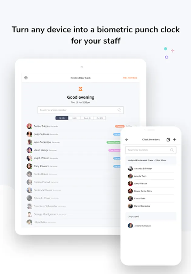 Allow team members to clock in from their own mobile devices. Alternatively, turn a tablet or mobile device into an attendance kiosk that entire teams or specific departments clock in and out from.