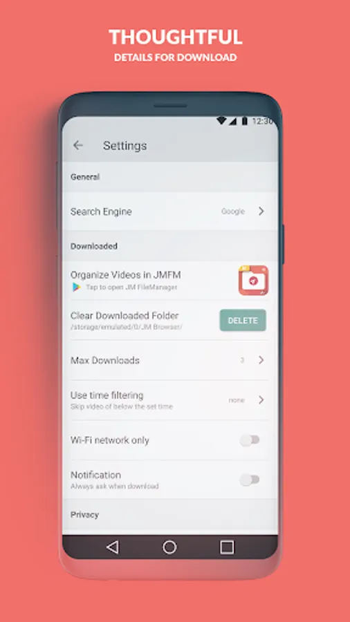 Prevent to overuse your cellular data! Limiting usage of cellular data by changing settings to allow downloads only over Wi-Fi is something that everyone has. But the dashboard with specific details of data usage is something that JM Browser proudly provides just for you. You can check daily, weekly, and monthly data usage at a glance to see how much data you are using for downloading videos.