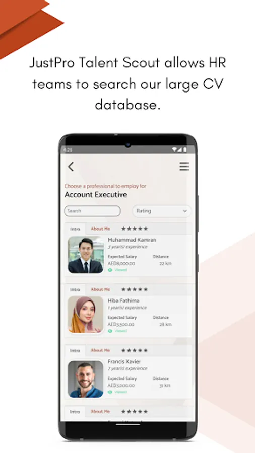 JustPro Talent Scout is a headhunting service that allows HR teams to easily browse through the resume of thousands of skilled workers in specific job categories. HR teams can easily view the resume of the employee, read through reviews from their past employers, and connect with them instantly by booking them for an interview directly on the app.