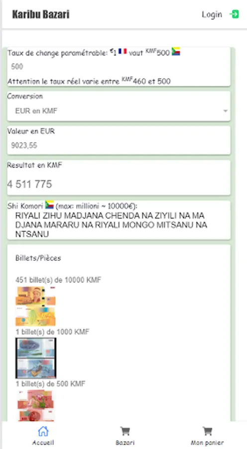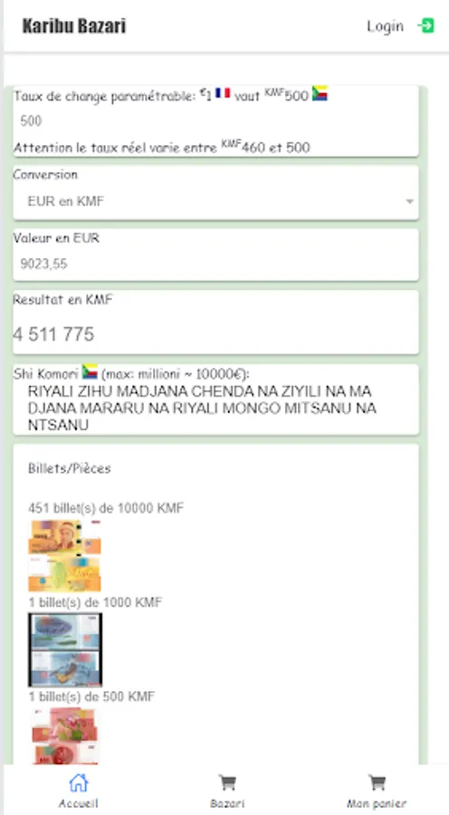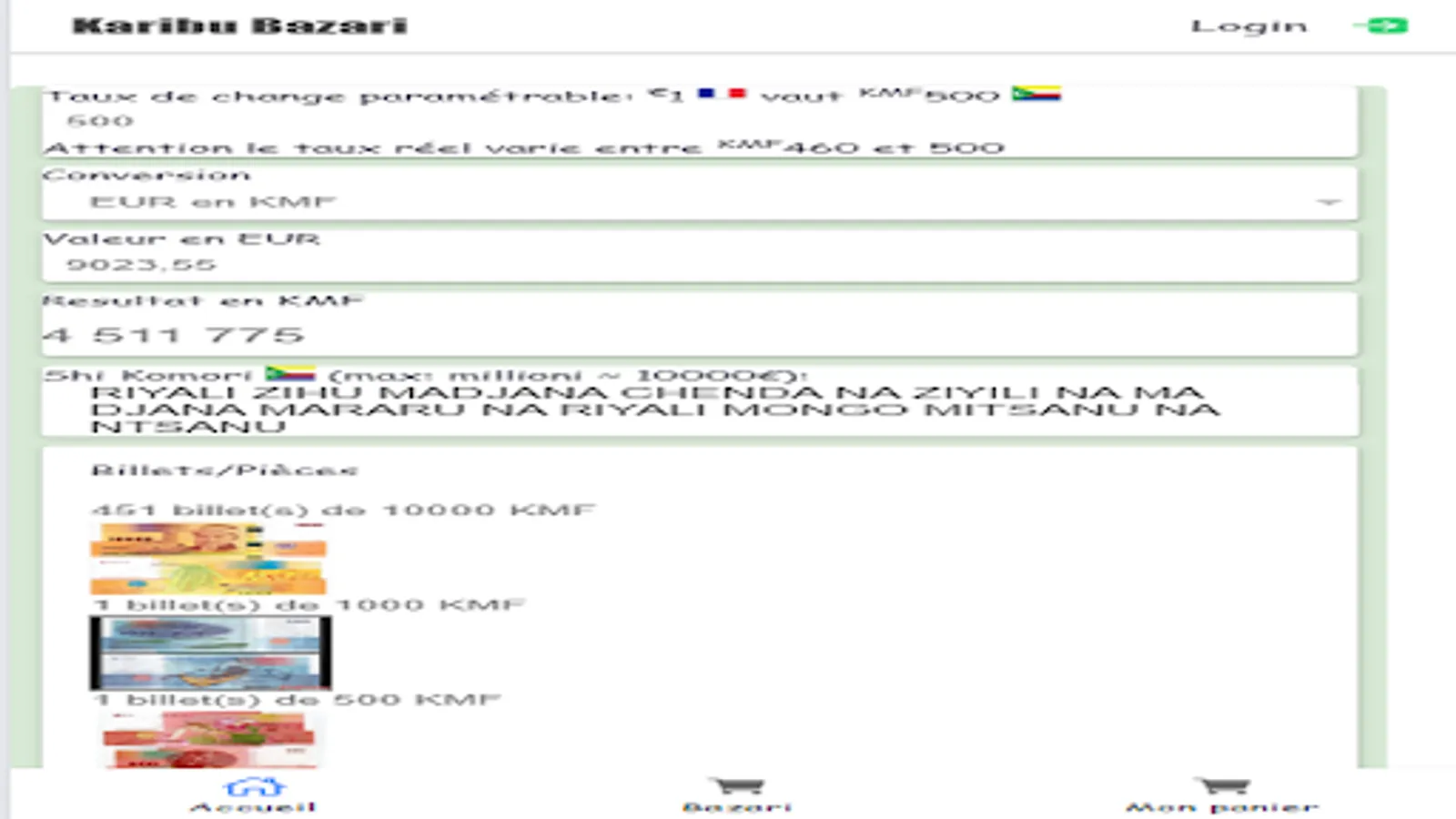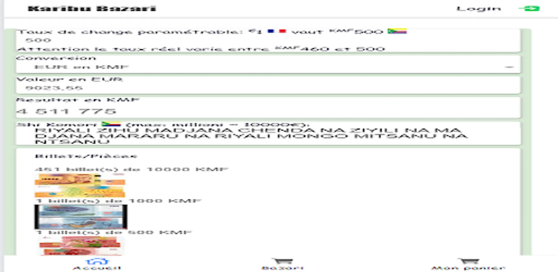 Platform for converting currencies EUR -> KMF (vice-versa), how to say a sum of money in Comorian, a market place is under development (mainly digital products online. We also plan a showcase for traders who are in the Comoros for more visibility). You can contact us if you want to exhibit your items in our app.