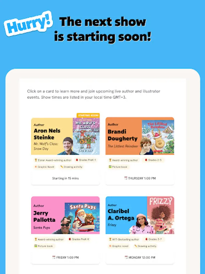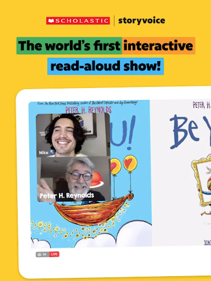 Every week, Storyvoice hosts a live read-along show featuring a new author or illustrator. All shows are free for classrooms and families to join and include moments when kids can ask questions, show off artwork, and practice reading with their favorite authors.