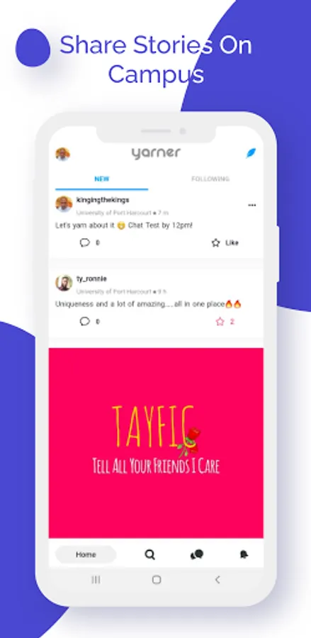 Share stories, pictures and videos. Yarn, Like, Share and Reply to Yarns. Yarner serves as a platform to share news, gist, pictures or short videos to friends, chat with friends, help your business reach more people, share interest, academic information, fashion style, Jobs opportunities and get to know about scholarships.